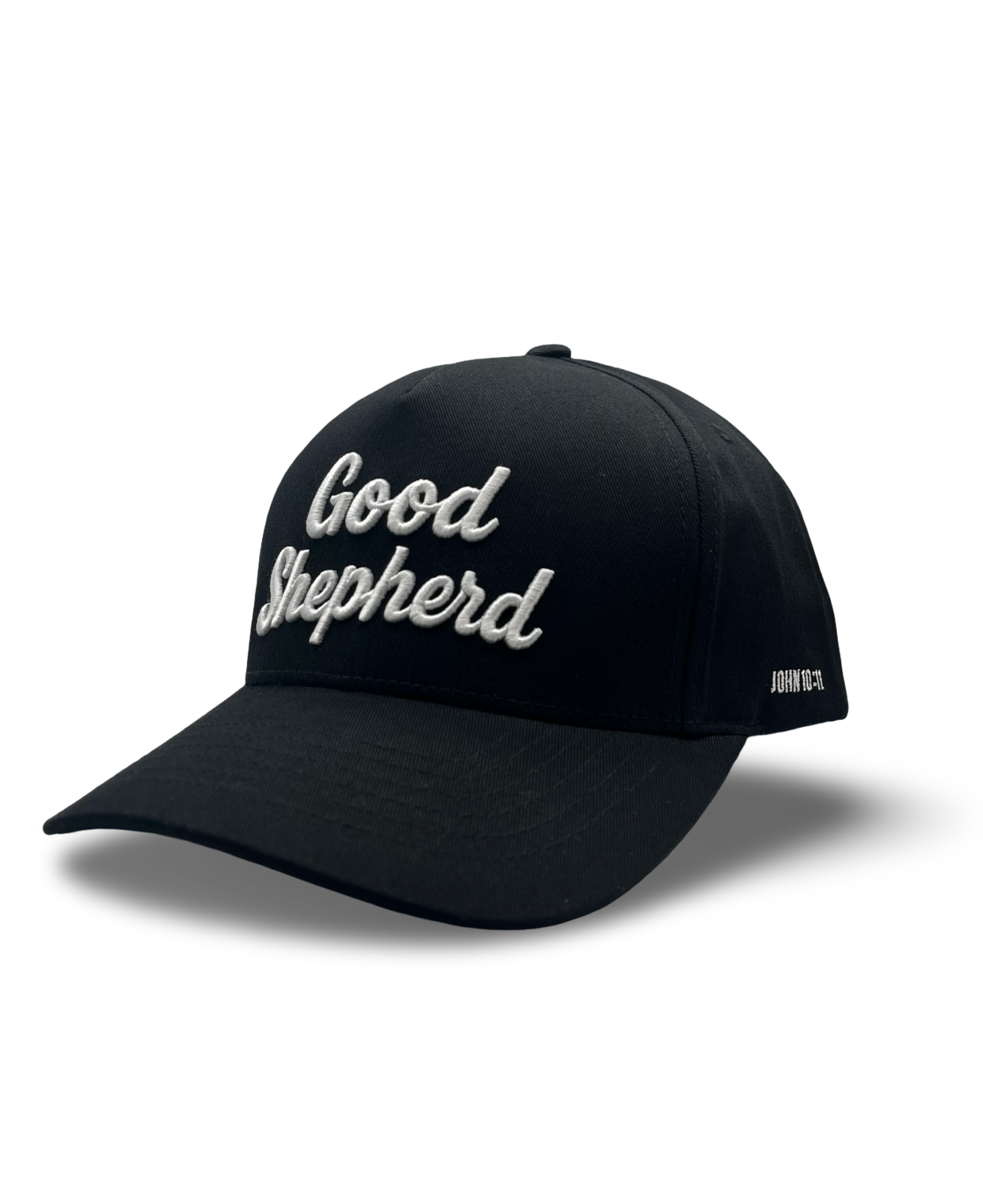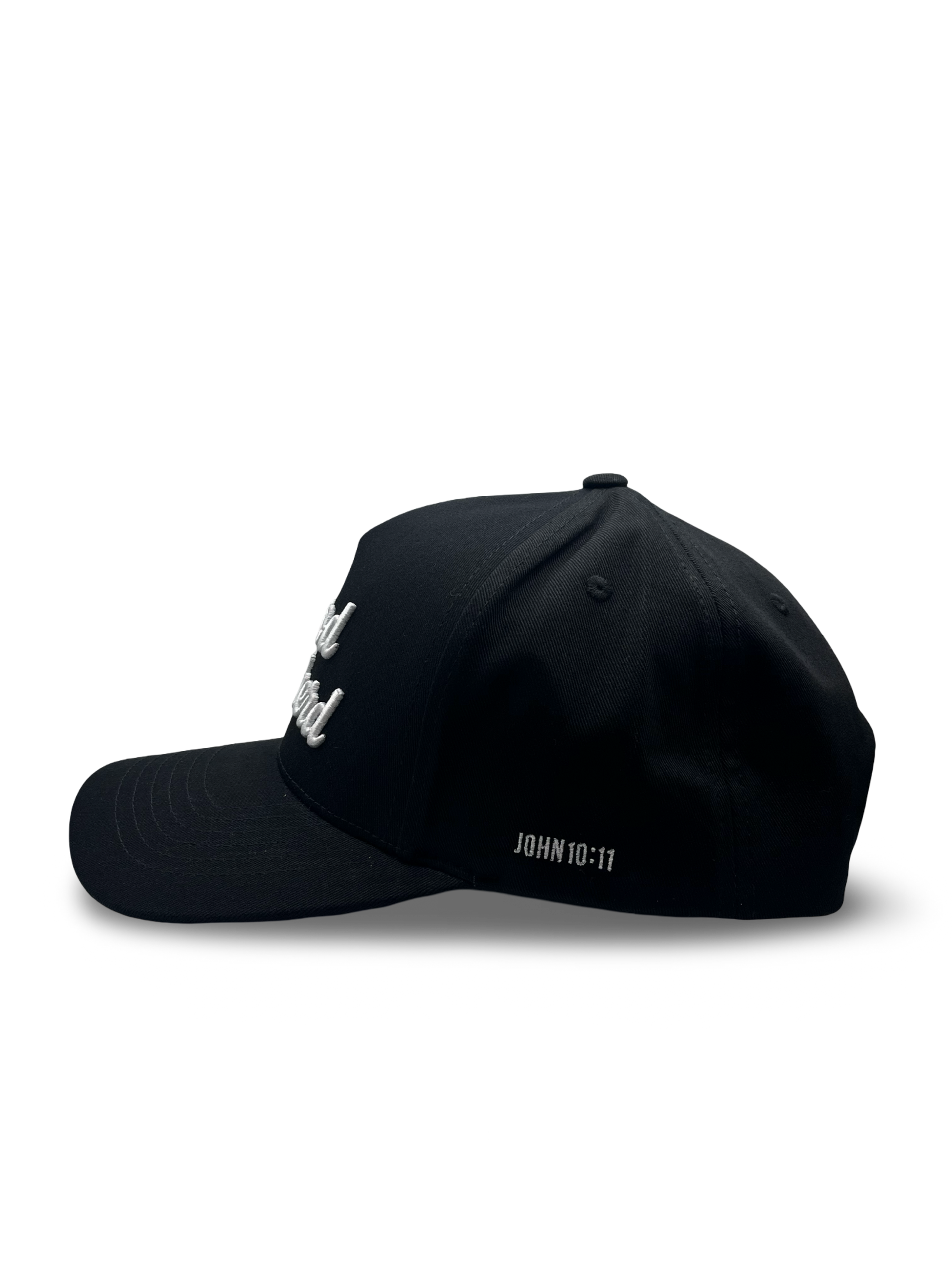 All-black snapback with raised white Good Shepherd embroidery. Simple, bold, and built for an everyday fit.