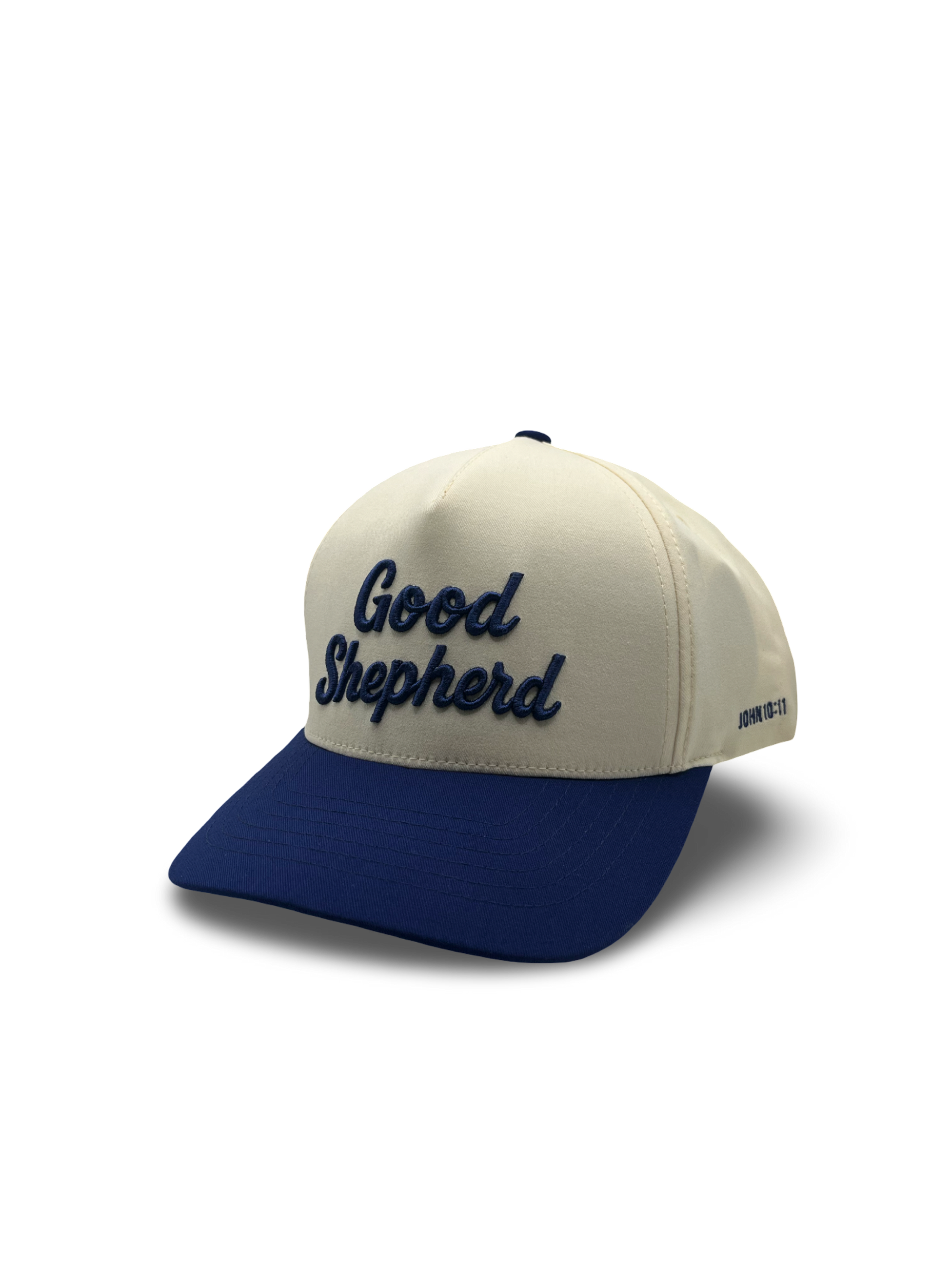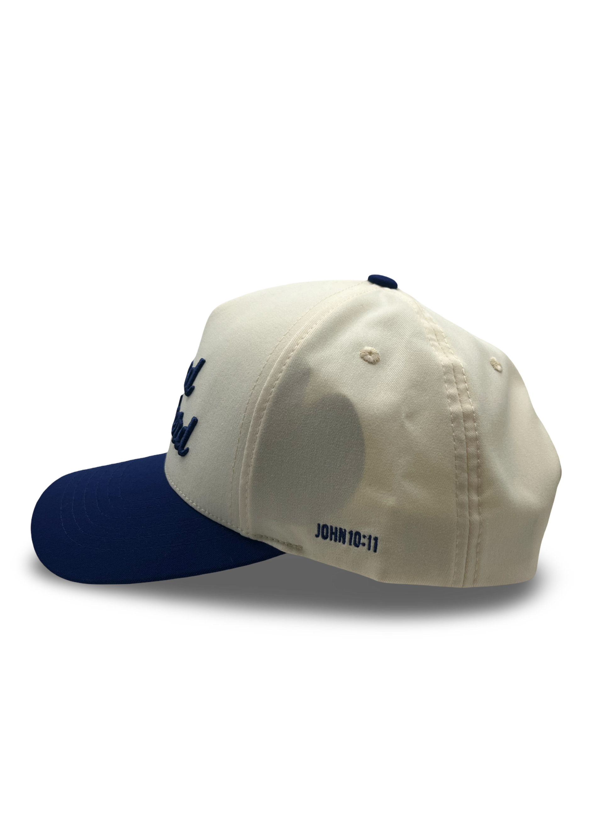 A clean two-tone classic featuring a crème crown, royal blue brim, and raised Good Shepherd embroidery. Finished with a structured fit, curved brim, and adjustable snapback for everyday wear.