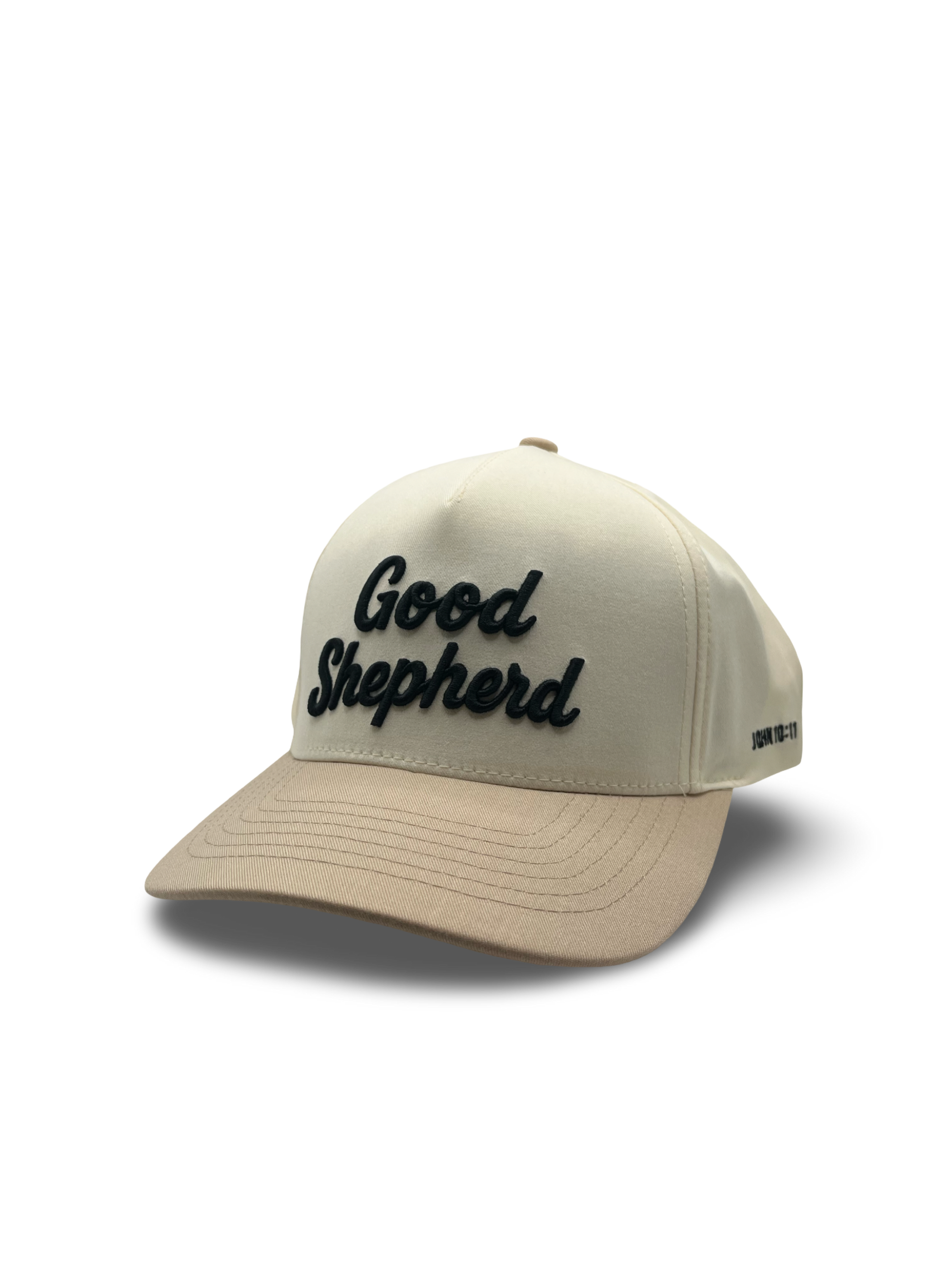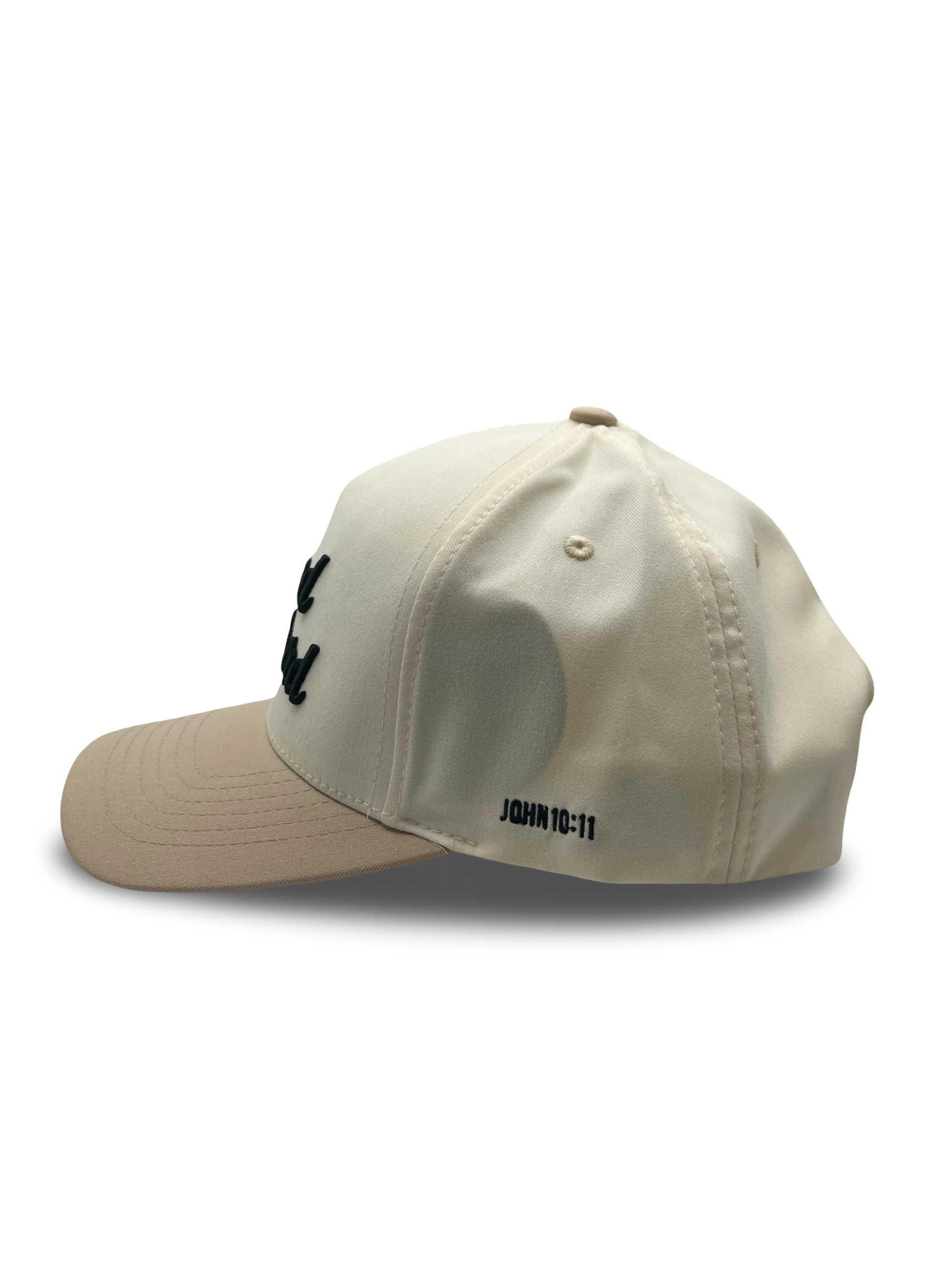 The Sand & Crème colorway features a soft cream crown, warm sand brim, and raised black Good Shepherd embroidery for a bold, classic finish. Designed with a structured fit and curved brim for comfort, durability, and effortless style.